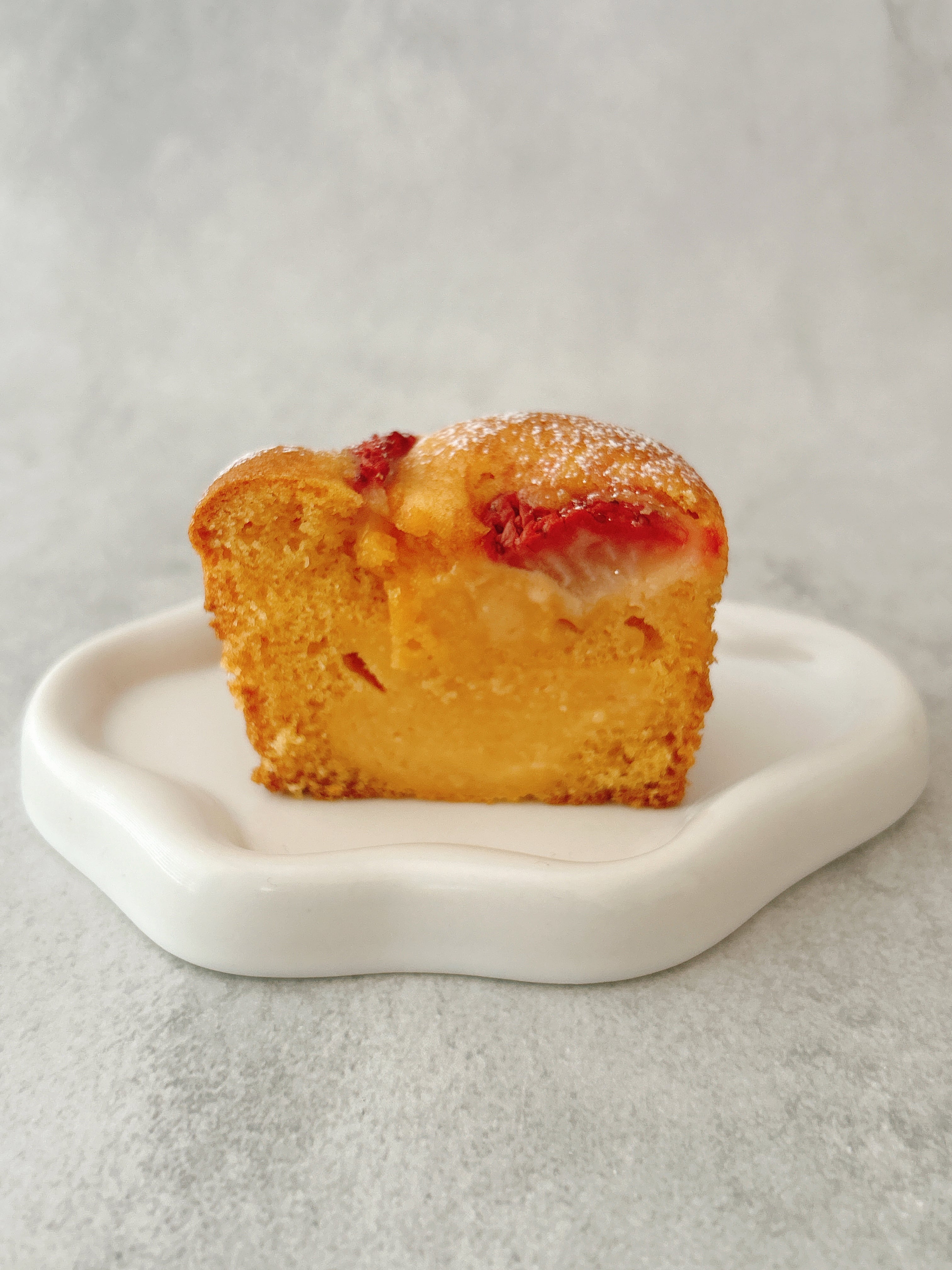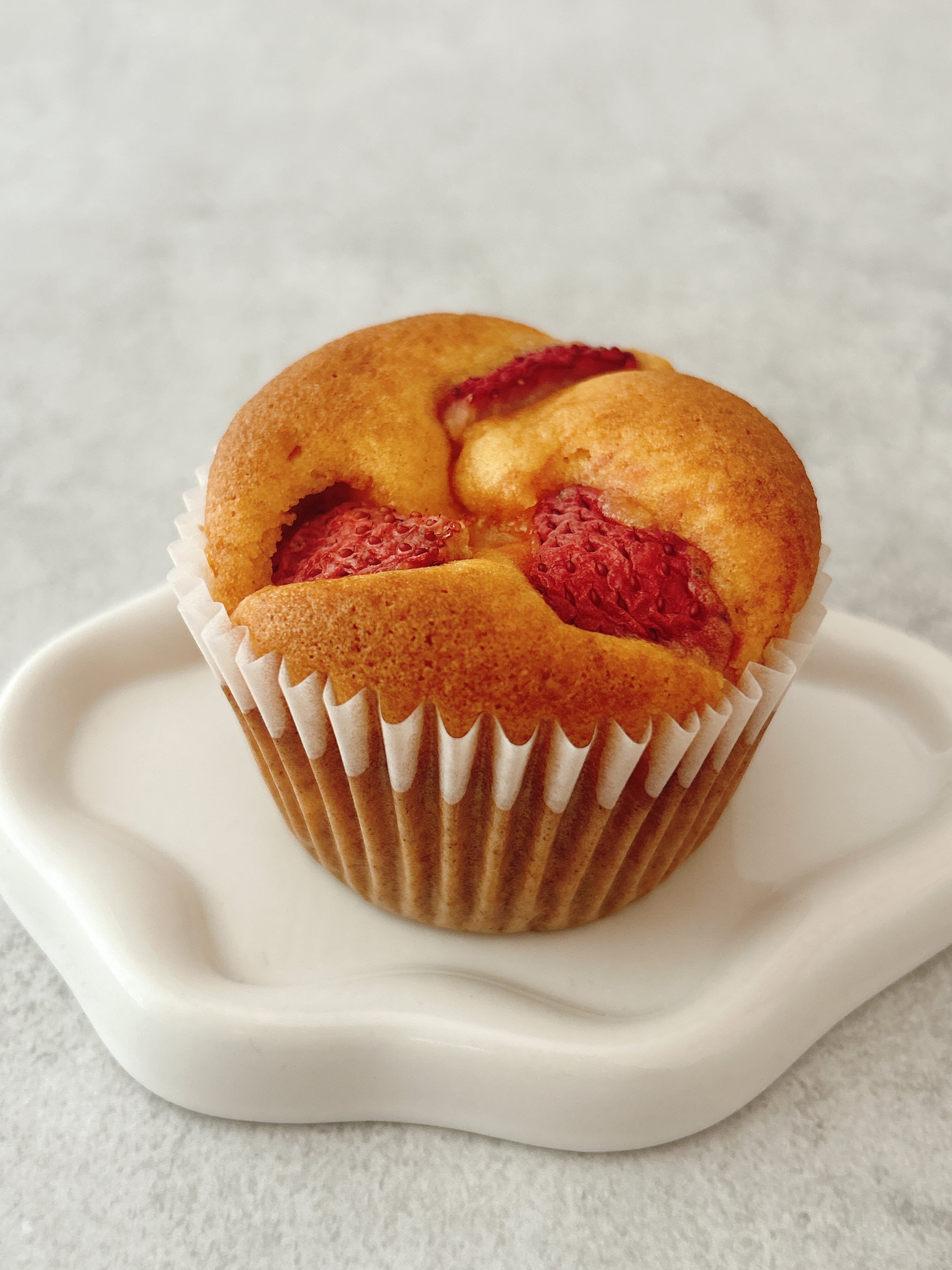 豆乳カスタードと自家製いちごジャムを入れたマフィンに、フレッシュいちごをのせて焼きました。甘酸っぱいいちごがおいしい春の限定マフィンです。